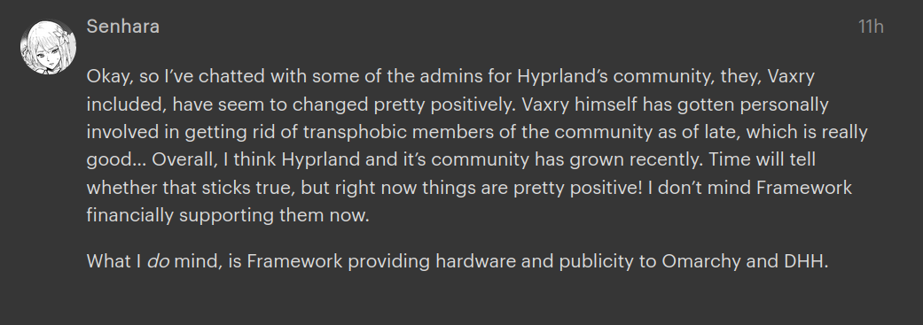 As of this time, when the Framework forum thread got published, a member of an affected group who did her own research, has asked around and found that , apparently, Vaxry has gotten way better at keeping Hyprland community clean from harassment and has led to creating a better, no-nonsense atmosphere for vulnerable people since then.
