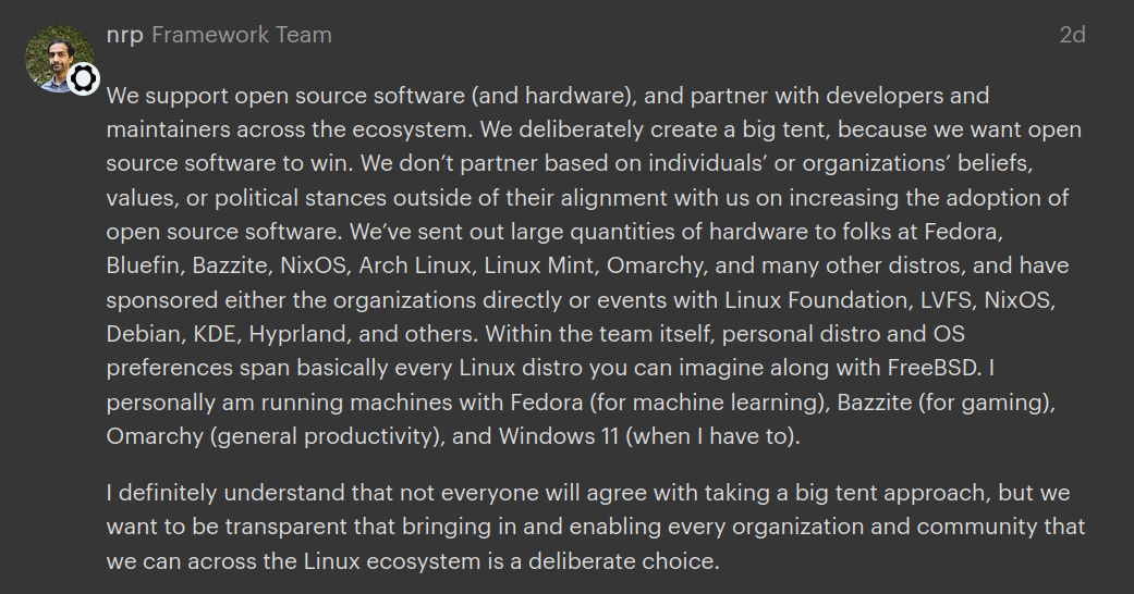 It makes sense that Framework’s audience has a sizeable portion of people who apply those principles of social consciousness to other political (objectively, not just commonly-discussed “political”) topics, too. For those people, it’s jarring to see Framework fervently promote a project so tightly coupled and benefitting a far-right figure. I’ll personally add - much less one whose actions and reckless/unskilled advocacy result in worse outcomes for open-source software, too. It turns out people have heaps of reasons to really dislike the guy.
