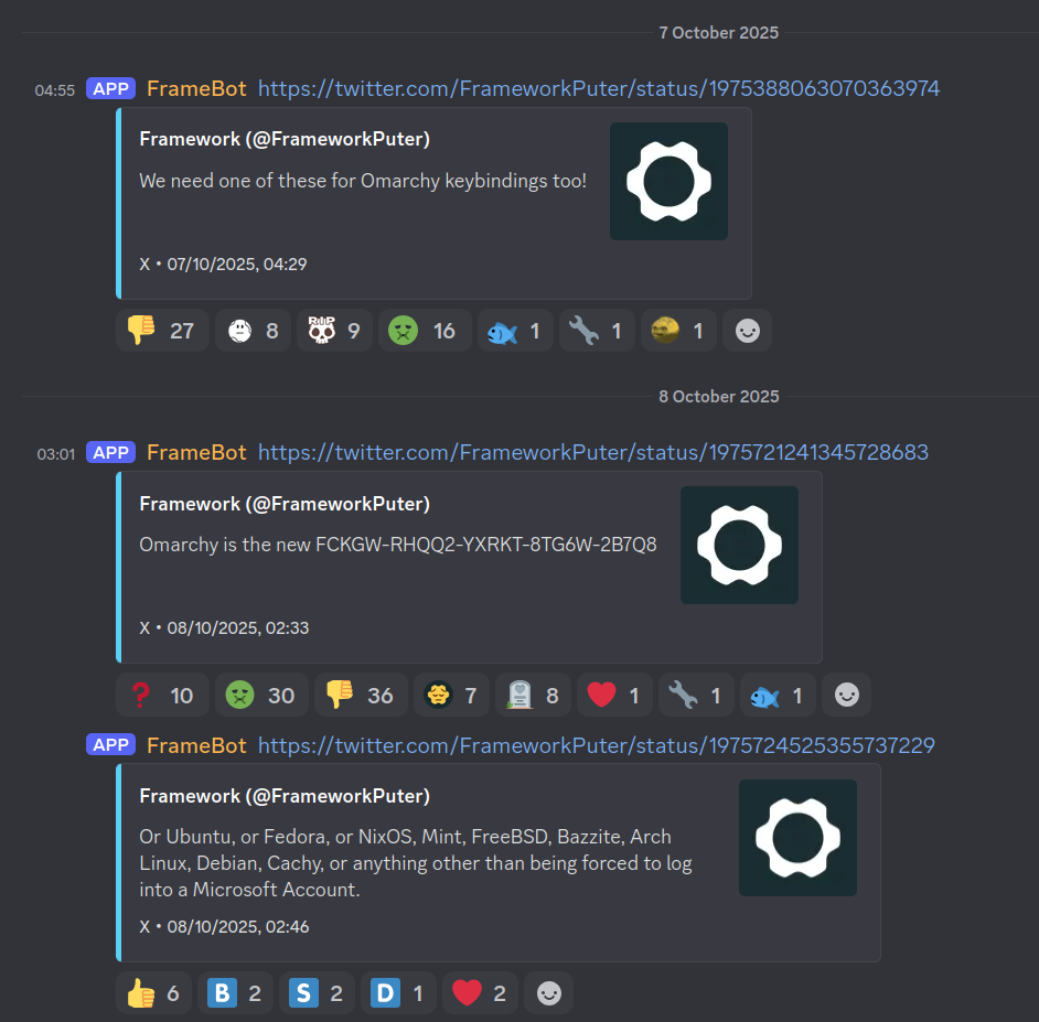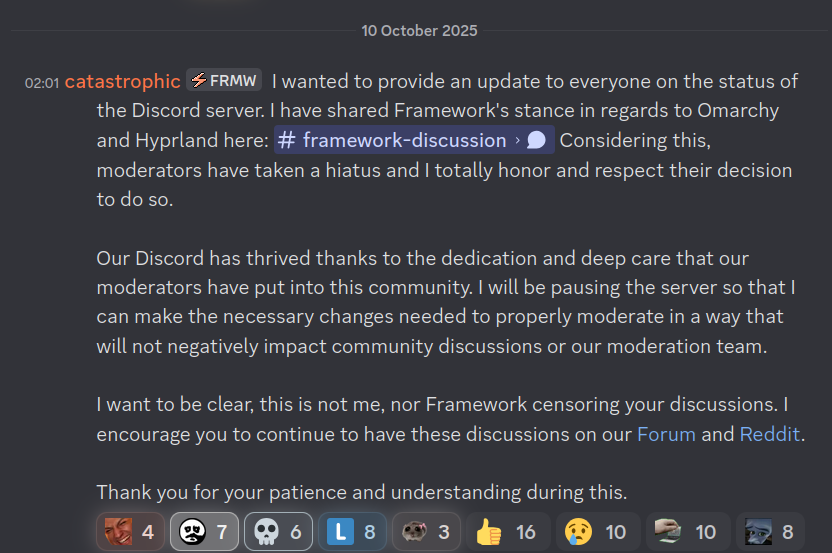 One another thing Framework looks out to get is a decrease in volunteer support. I have to say that Framework is notable in their support for the project’s volunteers, which is a smart decision for a product with a socially conscious mission. I’d expect at least some people to stick around, purely on the project’s merits. Currently, it does not seem to pan out well, however as far as the volunteer moderation team is concerned - though, again, they have their own very reasonable concerns about overlapping the audience with the Omarchy circles.