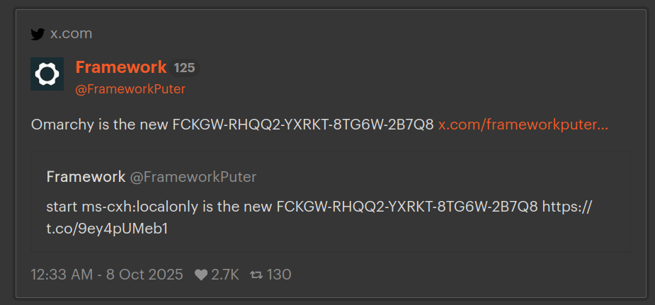 Naturally, it does not help that Omarchy is very visibly branded “by DHH”. It also doesn’t help that the DHH Ruby community drama got big enough to a point where you could learn about it through ambient non-political feed scrolling, just like I did. From a quick social media comment check, Framework social media amounts have received replies talking about DHH being a liability under their Omarchy posts, but they don’t appear to have reacted in any way.