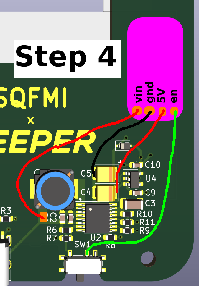 Use 4 wires to connect the TPS61023 breakout board into the Beepy board, replacing the U2. 5V and GND wires can be soldered onto either of the two yellow capacitors. The green-marked wire must be soldered to the slide switch middle pin.