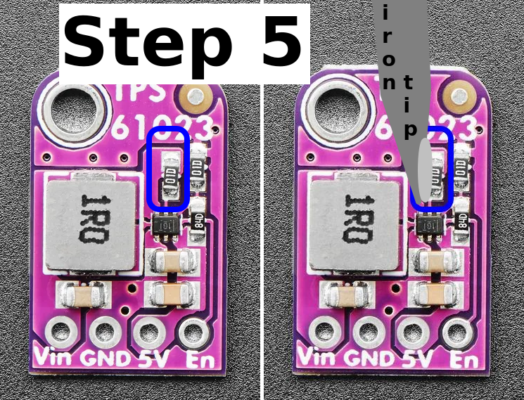Remove one resistor from the TPS61023 board, to make the Beepy power switch function properly again. Without this, your Beepy’s 5V regulator will always be on, irrespective of the slide switch position.